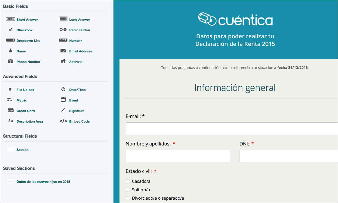 Este formulario está diseñado pensando en minimizar al máximo el número de campos, sólo preguntamos aquellas cosas estrictamente necesarias y que no tenemos en Cuéntica, intentando además traducir el lenguaje de la Agencia Tributaria a algo más comprensible por cualquier persona. A lo largo del formulario, jugamos con algunas preguntas “de control” que crean diferentes caminos lógicos: en función de lo que se va respondiendo, se van haciendo unas preguntas adicionales u otras.