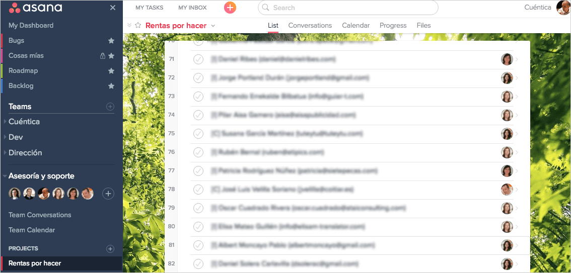 En Asana, todos los miembros del equipo de asesoría pueden ver rápidamente las rentas que hay pendientes, las que ya se han hecho, asignarse unas declaraciones a uno u otro, hacerse consultas, anotar casos especiales o notas internas, etc. Y todo queda registrado y documentado.