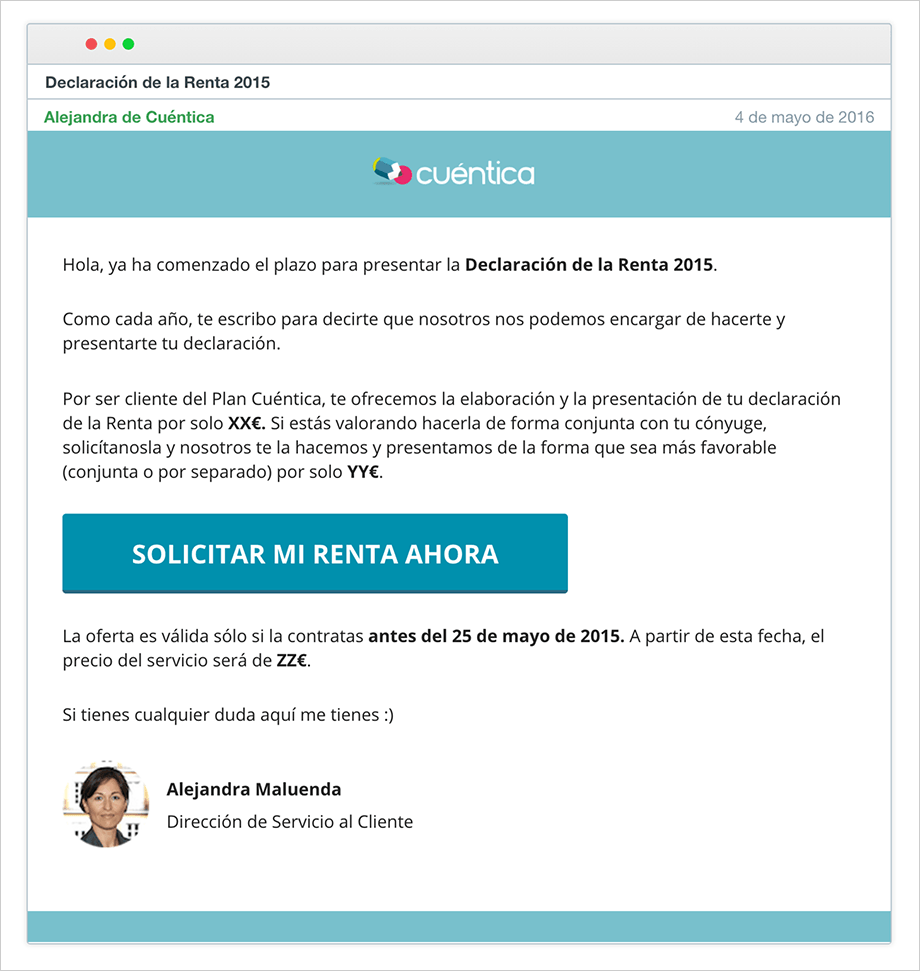 No hemos hecho ninguna promoción pública, es una campaña orientada únicamente a los clientes de Cuéntica. El día 4 de mayo enviamos los correos electrónicos ofreciendo el servicio, uno para cada cliente, detallando en el email su precio personalizado y un botón desde el que directamente contratar el servicio.
